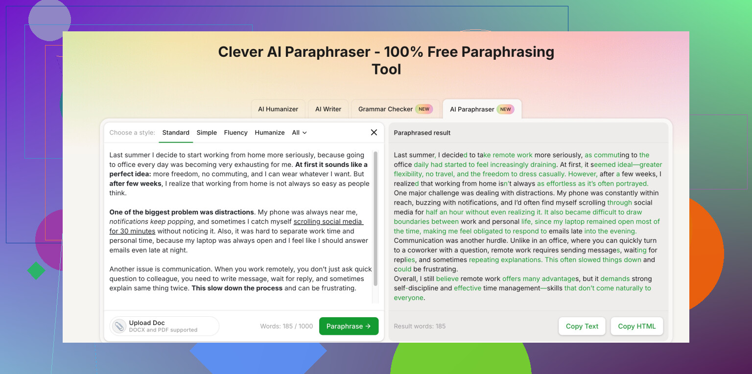 If you’re set on a tool, Clever AI Humanizer is worth a shot, especially for blog-style content. Its output tends to read more like a real human than those old-school spinners. Their AI-powered paraphrasing tool for natural, unique blog content is one of the better free options if you’re trying to avoid that “AI wrote this” vibe.