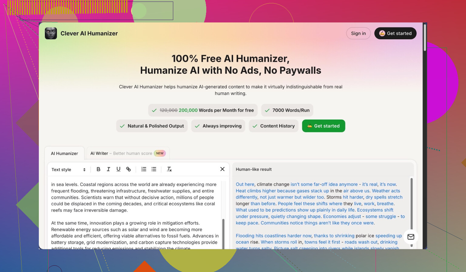 The big surprise is price. Most tools lock you after 200 to 500 words or a couple of runs. Clever AI gives you something like 200,000 words per month on the free plan, with chunks up to 7,000 words per run. I pushed that limit with long articles and it did not complain.